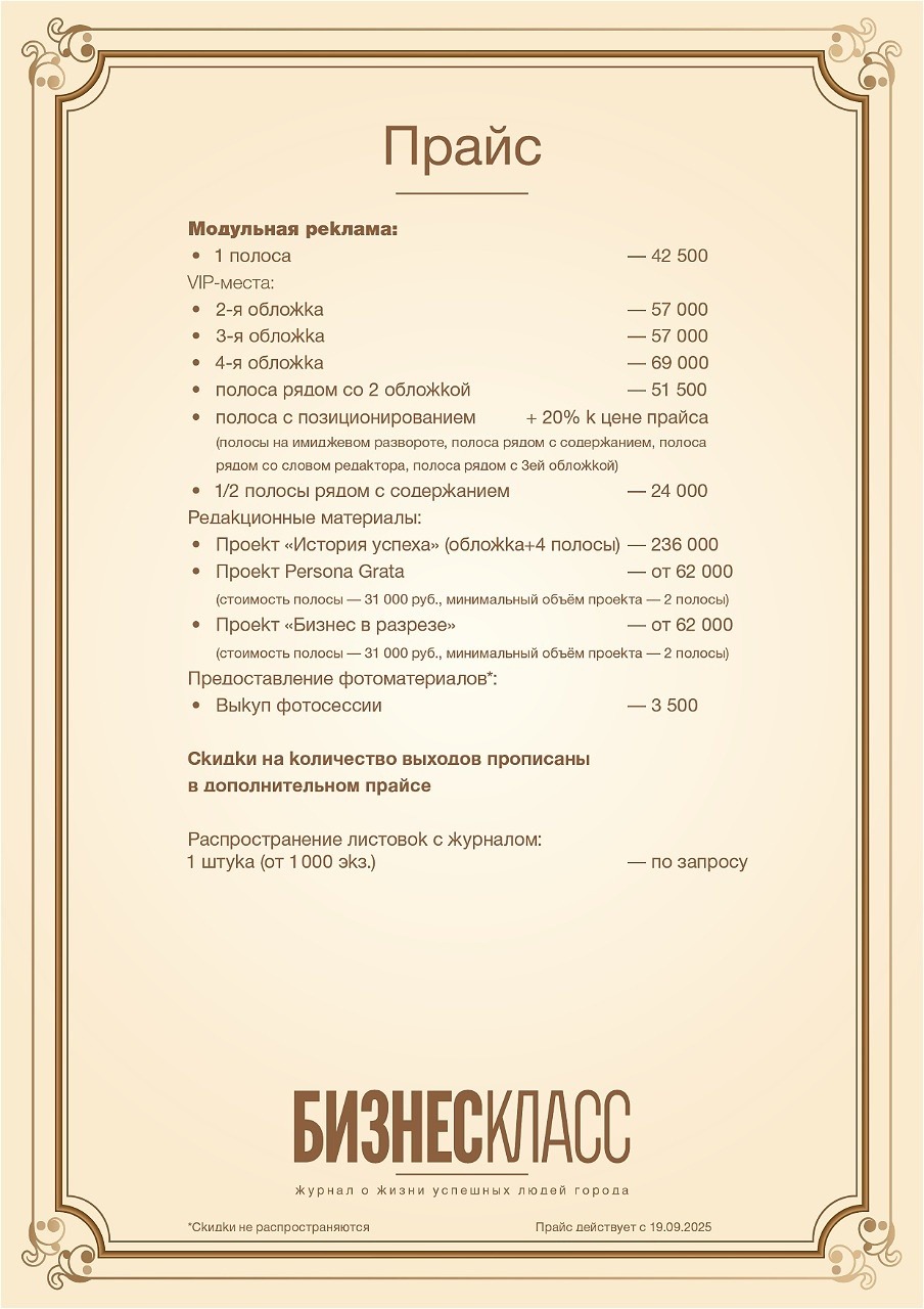 «Бизнес Класс» — это бесценный справочник опыта кировских бизнесменов. Об этом рассказывает каждая статья. Герой и читатель журнала — это одно лицо. Издание построено по принципу: «Прочитай о том, что я знаю, что я умею, попробуй повторить». Журнал — не только макеты, а еще возможность общаться читателям в формате b2b, что расширяет рамки и делает его более близким.