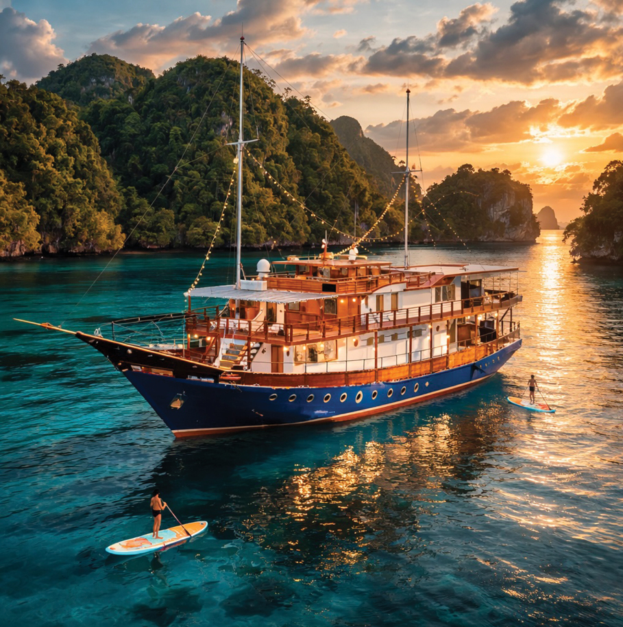 Каждый день круиза вас ждут новые острова и новые приключения. Вы войдёте в прозрачные воды Кали-Биру, где река встречается с морем в удивительном голубом свете. Будете завтракать под шум прибоя у острова Кри, чьи рифы удерживают мировой рекорд по количеству рыб на одном квадрате воды — 374 вида за одно погружение.