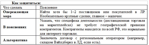 Контраргумент для селлеров. Специфика бизнеса на маркетплейсах (FBO) такова, что маркетплейс сам является ключевым контрагентом, берущим на себя логистику, хранение и выдачу. Требовать от селлера наличия склада или офиса в регионе – несоответствие цифровой реальности.