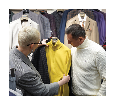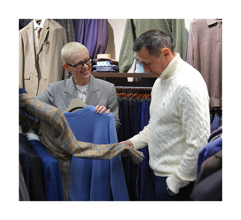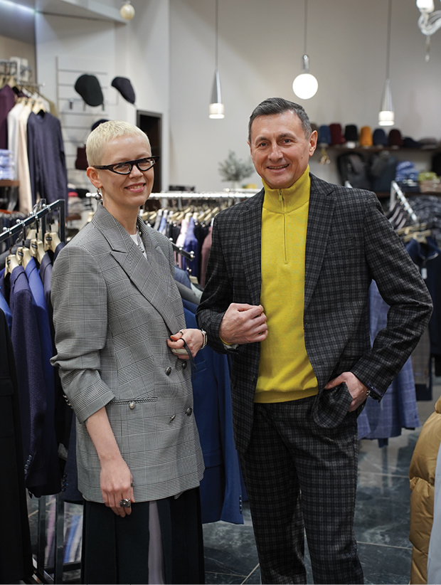 — Клетка — несомненный фаворит этого сезона, поэтому для комфортного кэжуалобраза мы выбрали очень «тактичную» расцветку костюма в серых оттенках. Серый — прекрасный фон для любых, даже самых энергичных цветов. И мы смело дополняем костюм ярким фисташковым джемпером. Живо, эмоционально и свежо!