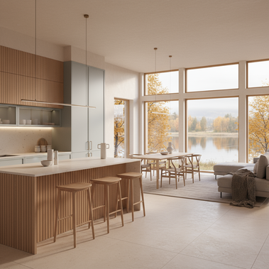 История: гостиная-кухня открытой планировки в частном доме на берегу озера. Для семьи с детьми, где ценят общение, уют и природу, а не показную роскошь.